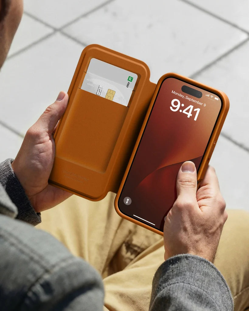 Glamour Folio protects the screen with a magnetic front flap that blocks scratches, dust, and accidental contact. It includes two built-in card slots for carrying daily essentials without extra bulk. The smooth vegan leather finish supports MagSafe charging and keeps the form slim and structured for everyday use.