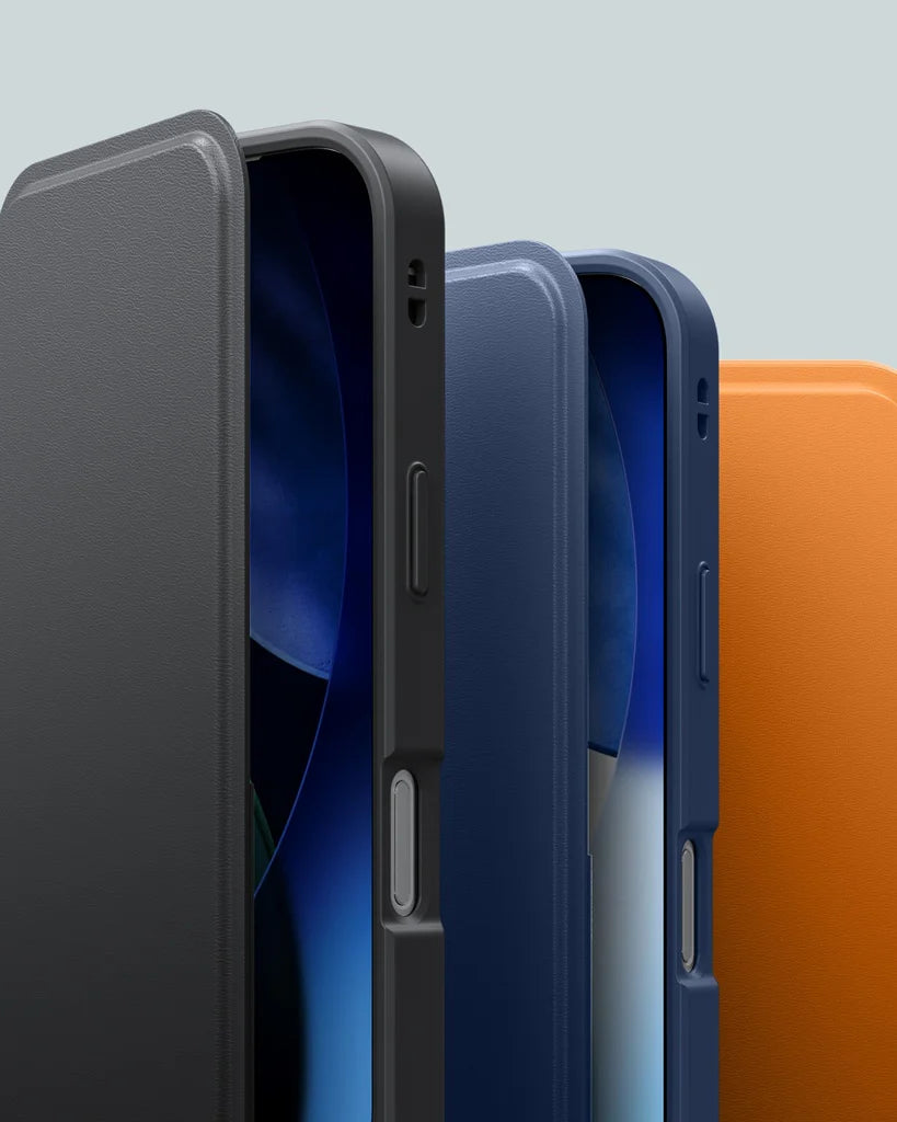 Glamour Folio protects the screen with a magnetic front flap that blocks scratches, dust, and accidental contact. It includes two built-in card slots for carrying daily essentials without extra bulk. The smooth vegan leather finish supports MagSafe charging and keeps the form slim and structured for everyday use.