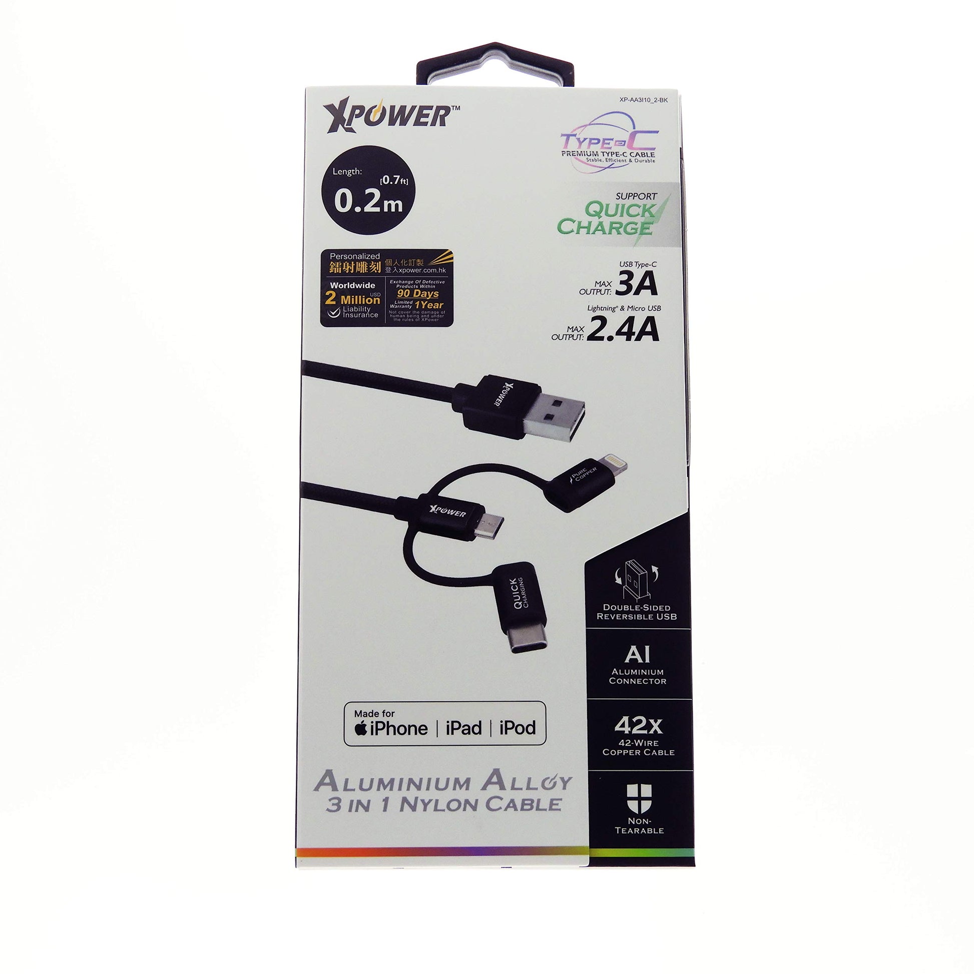 XPower 0.2m 3 in 1 Aluminium Alloy Cable (Type-c+microusb+mfi) (Black)
